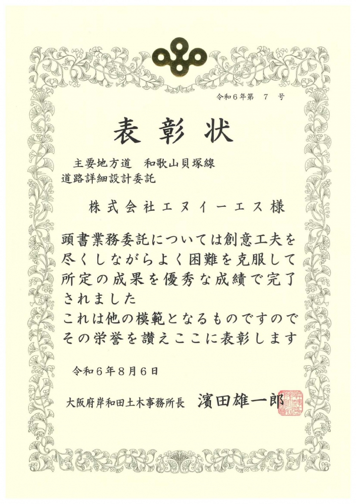 大阪府岸和田土木事務所において令和6年度優良建設工事等表彰式が行われ、当社が受注した業務「主要地方道 和歌山貝塚線 道路詳細設計委託」を優秀な成績で完了したことが評価され、所長表彰をいただきました。